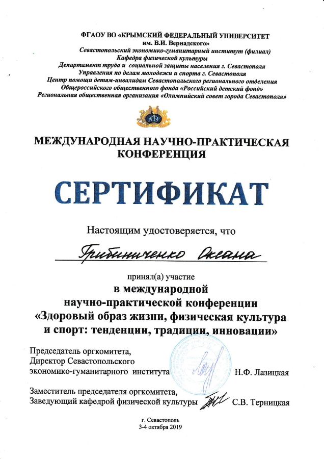 Представители ГКУ "Севастопольский реабилитационный центр для детей и подростков с ограниченными возможностями" Сардинова Раиса Алиевна., врач-педиатр, Грибиниченко Оксана Анатольевна., инструктор по адаптивной физической культуре приняли участие в международной научно-практической конференции "Здоровый образ жизни, физическая культура и спорт: тенденции, традиции, инновации" который проходил в г. Севастополе 3-4 октября 2019 года, под руководством ФГАОУ ВО "КРЫМСКИЙ ФЕДЕРАЛЬНЫЙ УНИВЕРСИТЕТ им. В.И. Вернадского".